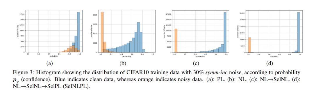 当涉及到有噪数据时,NL可能是一种更好的学习方法。但是,如果训练数据是无噪的,则PL是比NL更快,更准确的方法。在使用NL和SelNL进行训练之后,干净的和带噪的样本的置信度差很多,如图Figure3(c)所示。SelPL仅使用置信度超过