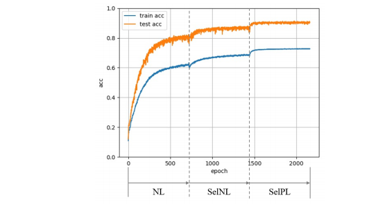 正如3.1节提到的,NL可以防止CNN过度拟合带噪样本,如Figure3(b)所示。下一步,我们介绍SelNL以改善NL之后的收敛性。用NL训练后,SelNL仅适用置信度超过1/c的数据训练CNN。在阈值化之后,训练中涉及的数据噪声往往比之前少,从而有效的提高了CNN的收敛性。Figure3(c)展示了NL之后的SelNL结果。