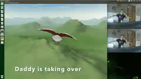 我只演示了一遍如何控制 Griffin 系统,跳一下就是起飞,展开手臂依靠姿势控制翅膀,Dexie 就学会了。由于游戏是第三人称视角,所以他很快就发现画面中翅膀的运动是直接和自己姿势同步的。随后他就开始享受自己的飞行体验了。没有什么是比你自己更好的游戏控制器了——记住乔布斯在发布第一代 iPhone 时嘲笑手写笔时所说的话。