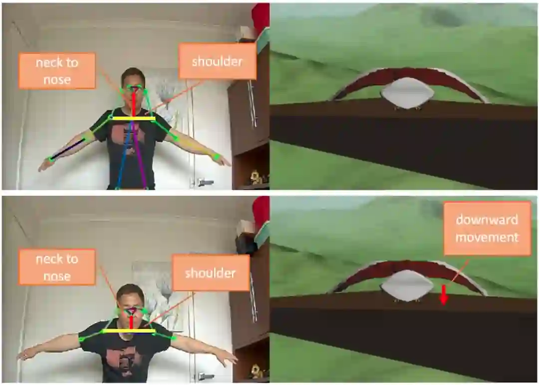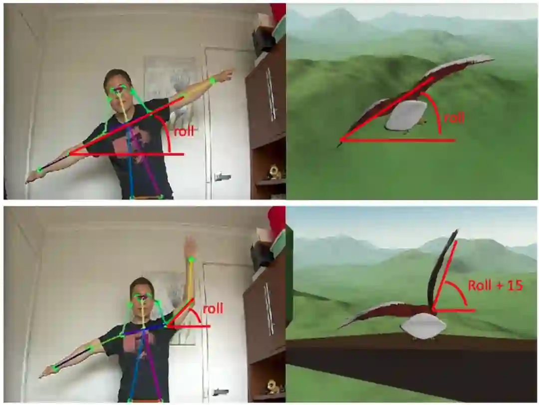 动作映射和手势识别:将身体姿态转化为有意义的动作和手势,如抬起左 / 右翅膀、左右翻滚身体、起飞等。