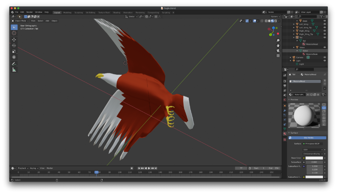 我增强了静态 3D 模型管理,以支持层级结构。原始的飞机模型是作为一个刚体移动的,它没有移动的身体部位。但是 Griffin 有两个翅膀,需要独立于身体单独运动。为此,我添加了两个翅膀,使之作为身体之上的单独 3D 模型。我可以单独旋转每个翅膀,也可以移动 Griffin 的身体,间接移动两个翅膀。实现该目标的一种恰当方式是构建骨骼动画系统,将身体部位组织为树结构的形式。但是,由于我要处理的身体部位只有三个(身体和两个翅膀),因此我可以选择一种简便的方式。为了编辑鹰和树 3D 模型,我使用了一个免费易用的 3D 编辑工具 Blender。