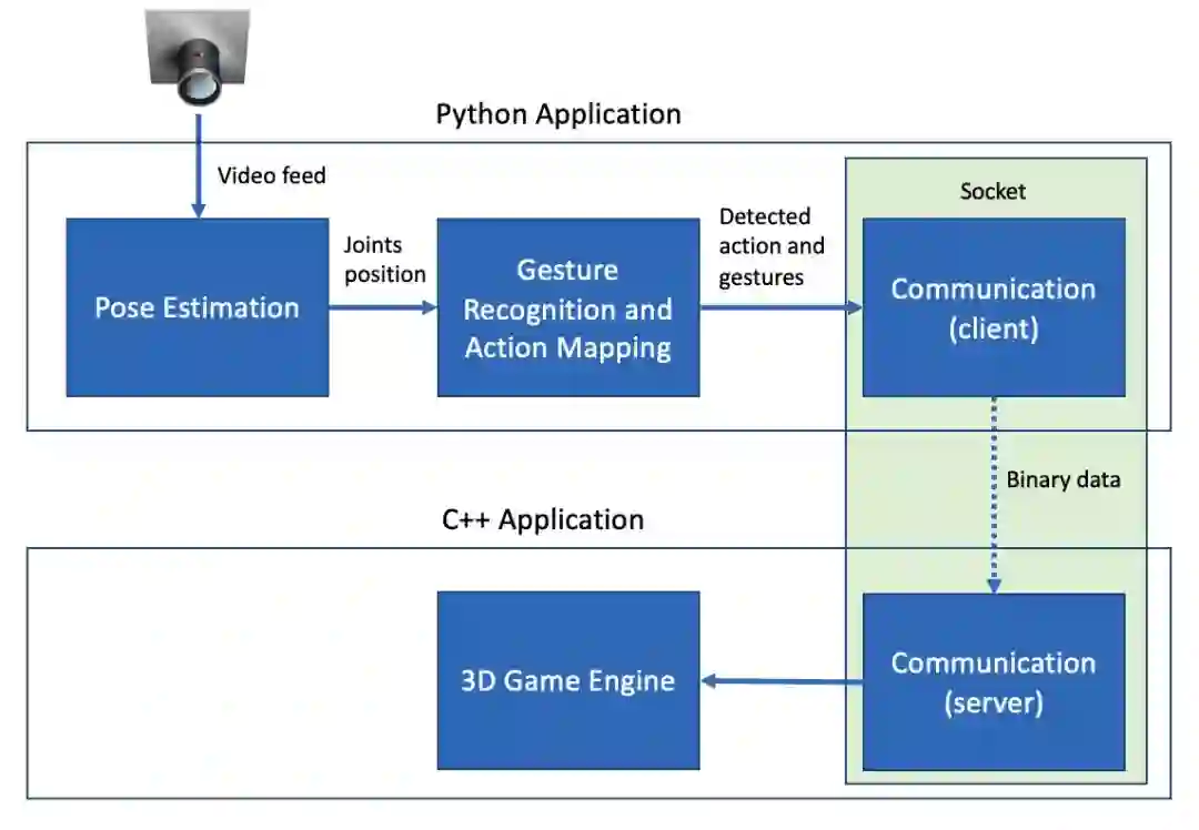 现在,我们完成了三个主要组件,只需要将它们粘合在一起就行了。我们需要将姿态估计模块检测到的人体关节点发送至手势识别模块,这个任务比较简单。但是,将动作和姿势映射结果发送至 3D 游戏引擎就不那么简单了,因为游戏引擎是用 C++ 写的。你可能会疑惑为什么不用 Python 构建 3D 游戏引擎,原因在于没有靠谱的方式来使用 Python 访问 OpenGL。此外,即使可能,我也不想花费好几周时间将 C++ 转换为 Python 代码。