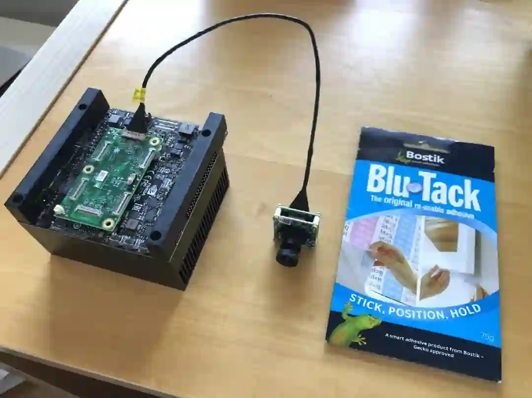 Jetson AGX Xavier、 IMX327 摄像头和 Blu Tack。