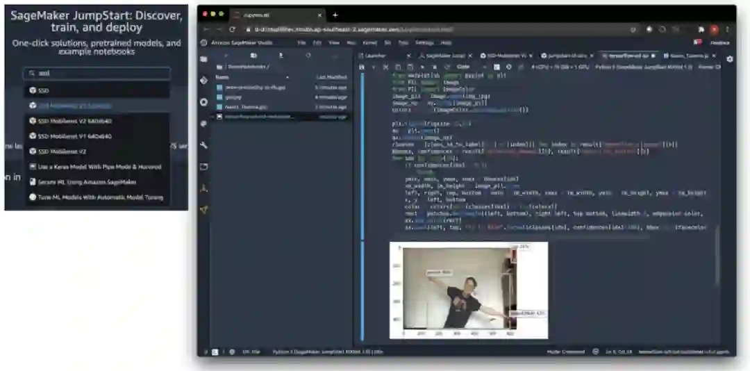 在之前的项目中,我手动训练过 SSDMobileNetV2 目标检测模型。这次我选择使用 Amazon SageMaker JumpStart,只需一键操作就可以从 TensorFlowHub 和 PyTorchHub 部署 AI 模型。这里有 150 多个可选的模型,其中就有经过完全预训练的 SSDMobileNetV2。