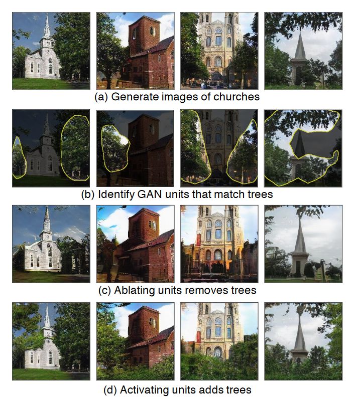 a) 由渐进式的生成式对抗网络生成的教堂图像; b) 给定预训练的渐进式生成式对抗网络,我们确定了对生成「树」这一场景级别负责的单元;c) 我们或者可以抑制将树从图像上「去掉」的那些单元…; d) 或者增大图像中树的密度。