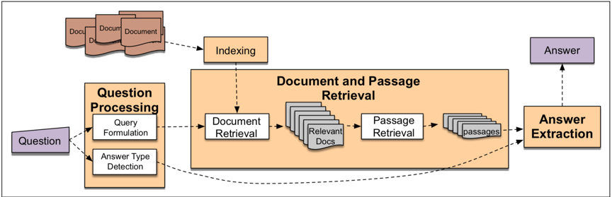 除了对问题做预处理,问题对应的答案实体类型也能给予我们很多信息。问题的实体答案类型可能是人名,地名,时间等等。具体的答案类型可以借助WordNet等进行自动化构建,或者直接手动构建。在构建好答案实体类别后,可以采用简单的基于规则的方法或者监督学习算法对答案实体类型进行分类。通常而言,question中会有一两个词语标志着答案的实体类型,这个词就相对而言比较重要,在一些方法中,该词可作为特征辅助文档问答。