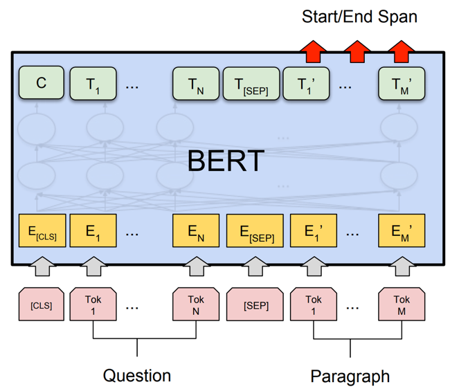 由于预训练模型在自然语言处理任务上的卓越性能,BERT等预训练模型成为阅读理解研究者们的心头好。如下图所示是使用BERT模型做阅读理解任务的示意图[4]。