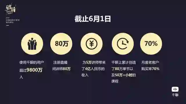 “千聊”是一个专注知识分享的语音直播平台,从去年5月上线付费直播功能以来,千聊的平台独立访问用户达到9800万,注册机构及讲师累计80万,平台总流水超过4亿,月均流水3500万。