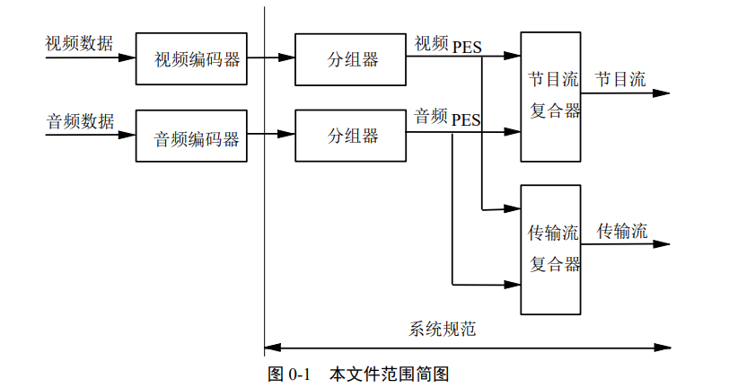本文件论述了这样一个问题,即如何将单路或多路基本音频和视频流以及其它数据组合成为适合于存储和传输的单路和多路复合流。系统编码遵循本规范指定的语法和语义规则,并提供了使解码器缓冲区能在一个宽范围的补偿或接收条件下同步解码的信息。系统编码被指定为两种形式:传输流和节目流。每一种针对不同的应用集合加以优化,本文件本文件中定义的传输流和节目流提供了编码语法,该语法对于同步解码及展现音频、视频信息是必要的也是充分的,同时保证了解码器中数据缓冲区不发生上溢和下溢。在该语法中,利用有关编码音频和视频数据解码和演示的时间戳以及有关数据流自身传输的时间戳对信息进行编码。传输流和节目流都是面向分组的多路复合流。单一音频和视频基本流的多路复合过程参见图0-1。视频数据按GB/T 17975.2或GB/T 20090.2或GB/T20090.16或GB/T 33475.2编码,音频数据按GB/T 17975.3或GB/T 20090.10或GB/T 33475.3或GB/T22726编码。压缩数据被打包以形成PES分组。在形成PES分组的过程中可能会加入独立使用传输流或节目流的PES分组所需的信息。当PES分组进一步与系统层信息结合形成传输流或节目流时,这一信息是不必要的也是不能加入的。本系统标准覆盖了竖直虚线右边所示的处理过程。