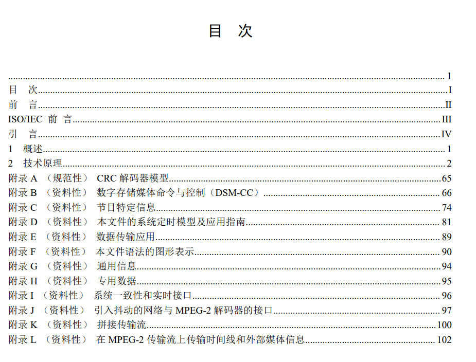 《信息技术运动图像及其伴音信息的通用编码第1部分:系统》国家标准意见稿,本文件给出系统层编码规范。它主要被设计用于支持把 GB/T 17975 第2 部分和第3 部分定义的视频和音频编码方式或者 GB/T 20090 第 2 部分、第 16 部分和第 10 部分定义的视频和音频编码方式或者GB/T 33475 第 2 部分和第 3 部分定义的视频和音频编码方式或者 GB/T 22726 定义的音频编码方式组合起来。系统层支持以下五个基本功能:1) 解码时多条压缩流的同步;2) 多条压缩流交织为一个单一流;3) 为启动解码而对缓冲区进行初始化;4) 连续的缓冲区管理;5) 时间标识。