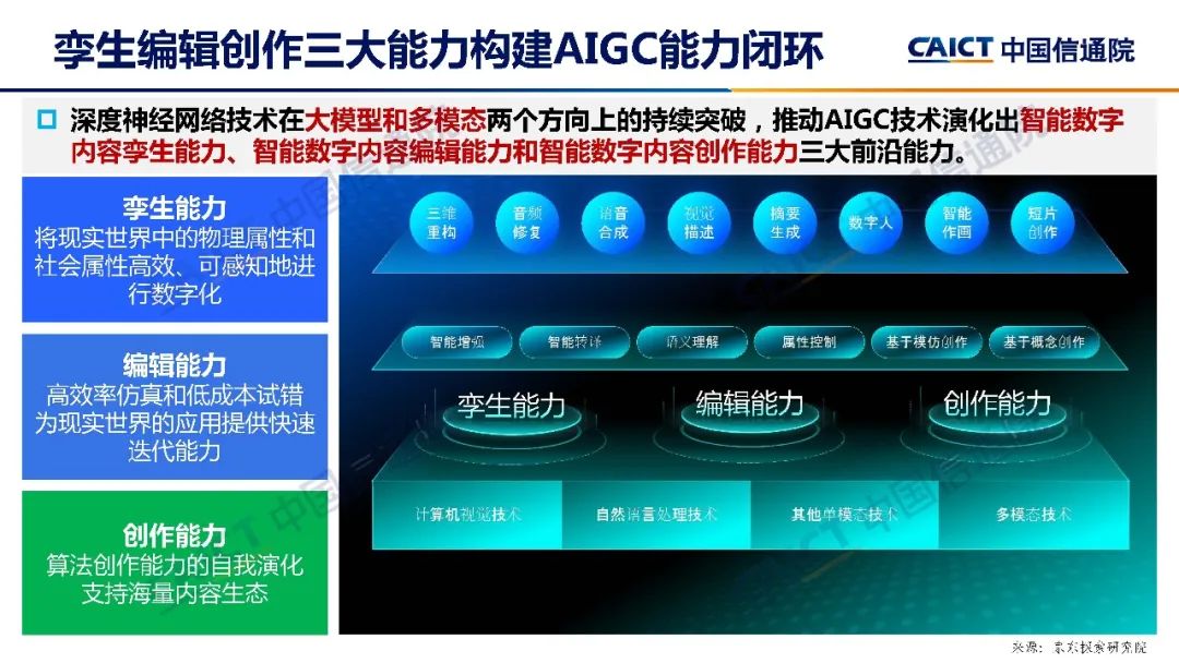 白皮书对人工智能生成内容(AIGC)当前技术发展和能力体系做出全面梳理,认为深度神经网络技术在大模型和多模态两个方向上的持续突破,推动AIGC技术演化出孪生、编辑、创作三大前沿能力。白皮书所提炼的AIGC技术能力体系,既涵盖了相关技术的最新进展和未来发展方向,也囊括了助力AIGC应用创新和产品落地的三大核心能力。