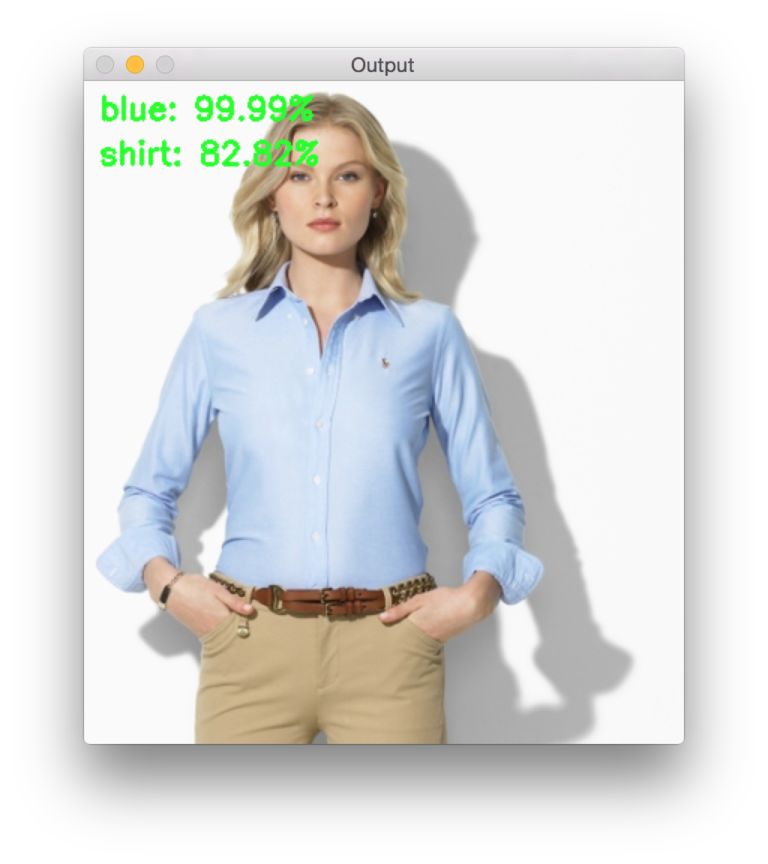 我们的模型非常确信它看到了蓝色,但有些许不自信它碰到了一件衬衫。话虽这么说,这仍然是一个正确的多标签分类!