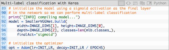 在第92至第95行中,我们构建SmallerVGGNet模型,finalAct=”sigmoid”这个参数指明我们将执行多标签分类。