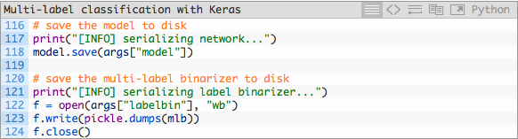 在完成训练之后我们可以将模型和标签二值化器储存至磁盘:
