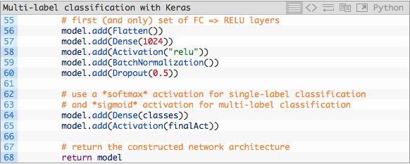 可选参数finalAct(默认值为“softmax”)将会在神经网络底部被应用。将这个值由softmax改为sigmoid将允许我们基于Keras执行多标签分类。
