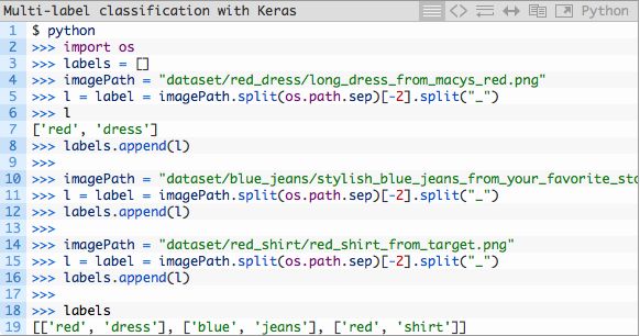 请注意在Python命令行(为了不与train.py中的代码块混淆)中的第17行,有两个分类标签是“hot”(在数组中用一个“1”表示),表明这各个标签的出现。在本例中,“dress”和“red”在数组中是“hot”(第14至第17行)。其他所有标签的值为“0”。