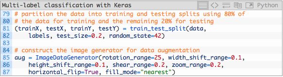 我们的数据增强器对象在第85至第87中被初始化。当你的没类数据少于1000张图像时,数据增强是一个最好的实践也或许是一个“必须”的实践。