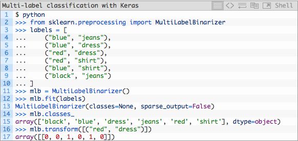 这里是一个展现MultiLabelBinarizer如何将(“red”,“dress”)元组转换为一个有6个类别的向量的例子: