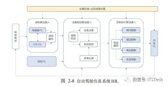 仿真平台除了借助传感器仿真、车辆动力学仿真,通过纯软件的方式接入自动驾驶感知和决策控制系统形成闭环测试之外,集成部分硬件系统的验证测试也是系统开发与验证不可或缺的一部分。通过仿真环境,结合部分硬件系统的计算结果进行测试,可以使软件和硬件的兼容性和功能完整性得以验证,用较低的成本测量验证子系统模块功能安全性,局部子系统的全方位测试验证,可以方便有针对性的达到系统辨识和错误追踪定位的目的。如图 2-8 所示,在自动驾驶仿真系统解耦架构的基础上,作为自动驾驶系统的感知部分,包括摄像头、激光雷达、毫米波雷达、超声波雷达、GPS/IMU、V2X 等,该部分的性能决定了自动驾驶车辆能否适应复杂多变的交通环境。针对不同的传感器,HIL(硬件在环)会根据不同的传感器和环境因素来部署。前面我们提到传感器仿真中的物理信号仿真和原始信号仿真,都与 HIL 相关。
