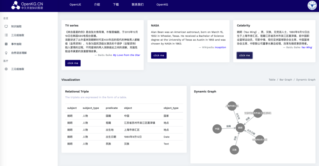 OpenKG(中文开放知识图谱)旨在推动以中文为核心的知识图谱数据的开放、互联及众包,并促进知识图谱算法、工具及平台的开源开放。
