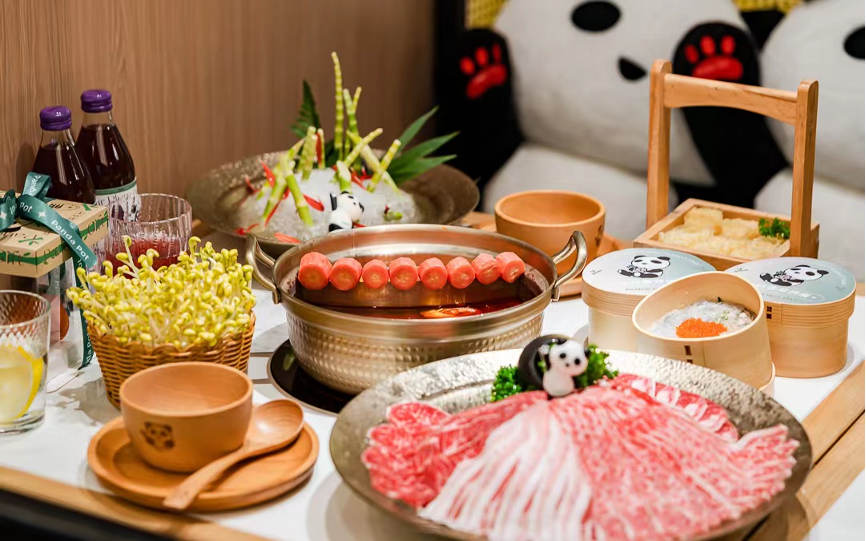 ——熊猫IP牛油麻辣锅+现熬水果鸡汤锅,打开了精致休闲小聚火锅料理的想象空间;其次,打造出品牌专属IP—热爱美食的熊猫