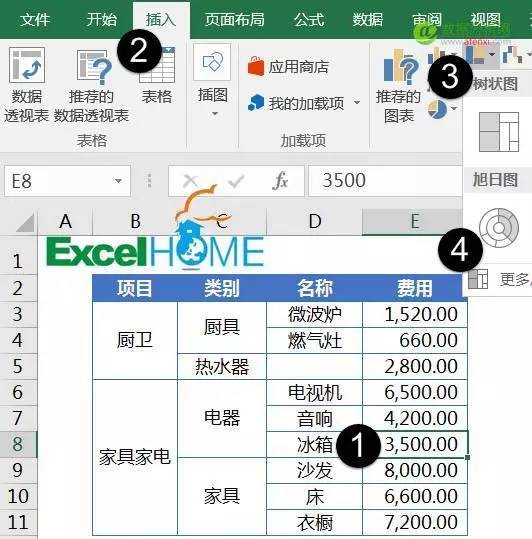 1.选中表内所有数据,单击【插入】-【旭日图】。