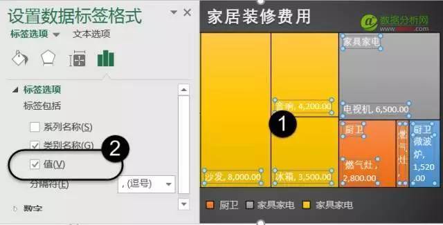 再选中图表上任意数据标签,在“设置数据标签格式”窗格中选中“值”。