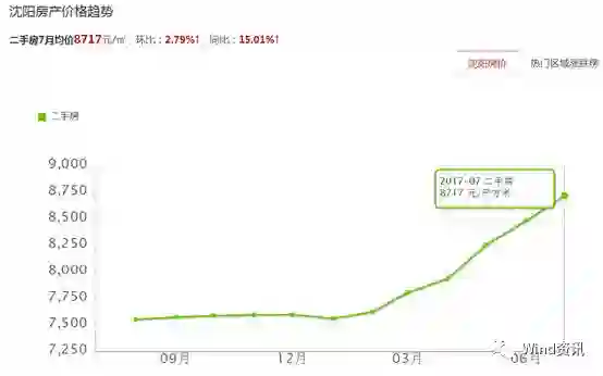 从搜房网的数据可以看到,沈阳的房价也是今年春节后才开始爬坡的。二手房成交均价从年初的7500元/㎡出头,涨到了7月的8717元/㎡,涨幅逾15%。