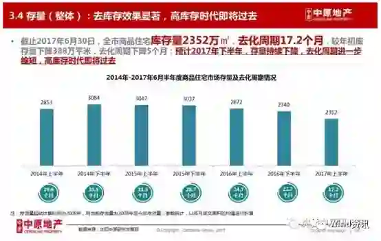 2017上半年地产销售面积为74662万平米,其中住宅地产销售面积为64791万平米。使用上面计算出的库存数据,可知用上半年的销售速度,广义地产库存的去化周期30.3个月,狭义地产库存的去化周期为5.2个月;住宅广义地产库存的去化周期24.5个月,狭义地产库存的去化周期为3.8个月。