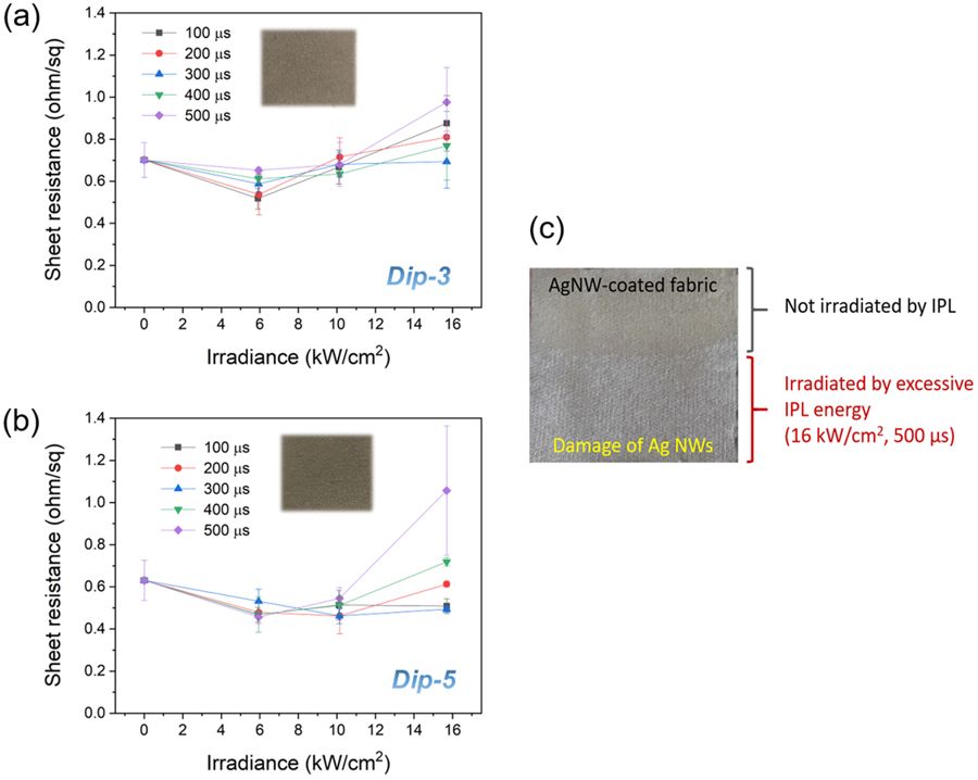 IPL烧结的银纳米线织物的电气特性。不同辐照度和脉冲宽度(a) Dip-3 (b) Dip-5,IPL烧结的银纳米线织物的表面电阻。(c) 银纳米线纤维半暴露在脉冲持续时间 500 µs 、IPL辐照度 6 kW·cm−2 的环境中。(图片来源:参考资料【2】)