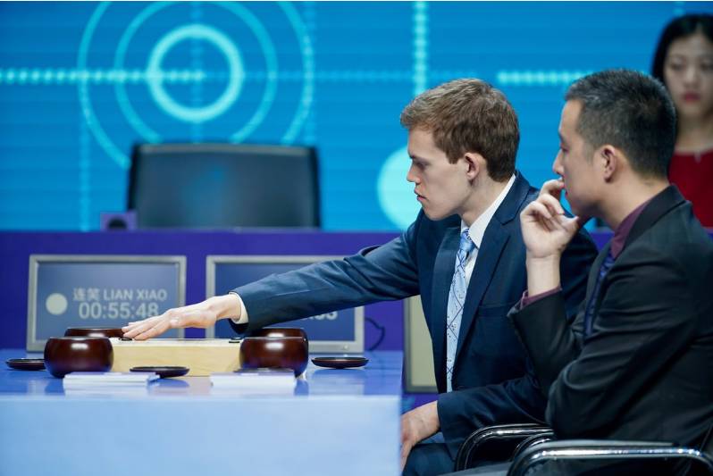 早上 8:30 开始的配对赛同样采取中国规则,人和机器轮流落子。现年 23 岁的连笑八段执白,34 岁的古力九段执黑。黑棋上来还是点了三三。AlphaGo 走棋悬念连连,在这种情况下,人类棋手也连出奇招。相较于柯洁的比赛,人机配对赛中,双方下子很快,同时因为 AlphaGo 的加入,两方实力差距大幅缩小。