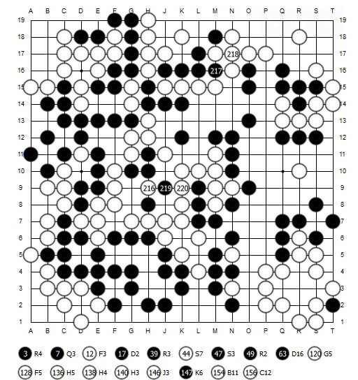 行至 70 手,形势落后的人类团队决定在上边屠杀白棋大龙,但被白棋在 80 手大飞化解。随后两方在右上角展开劫争,双方消耗劫材。到 133 手,黑棋在右上角开劫,侵蚀了右上角白棋的领地。比赛逐渐进入收官阶段。至 186 手,唐韦星上前代替周睿羊接手落子。行至 254 手,在左下角扑得手后,因大势已去,团体五人决定投子认负。