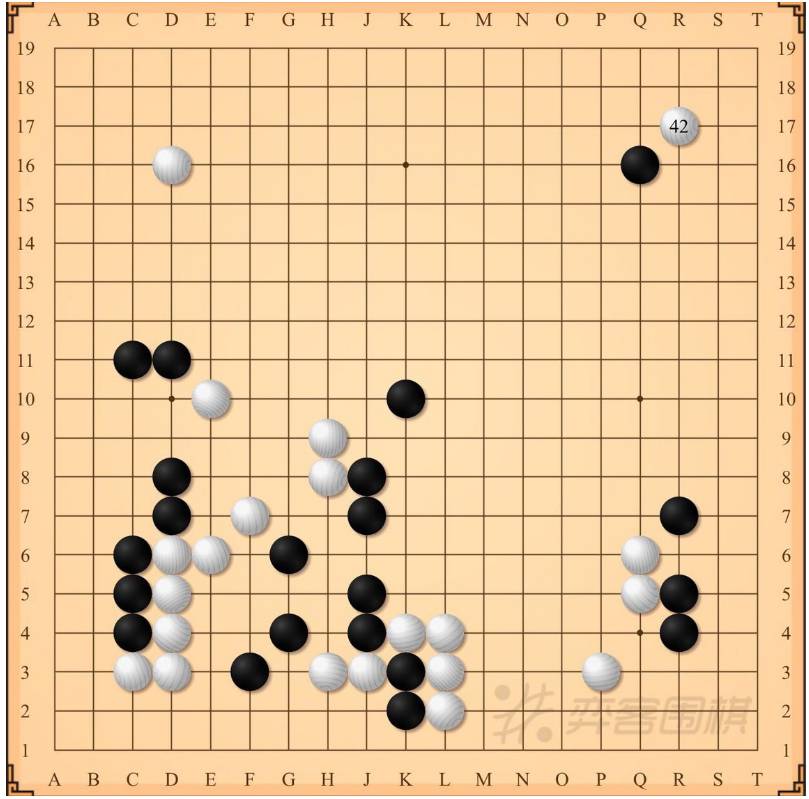 中午 12:30 团体赛开始,猜先后,由周睿羊代表人类棋手一方执黑棋,黄士杰博士代表 AlphaGo 执白。布局阶段波澜不惊,人类方吸取了上午比赛的教训,选择了三三布局而非星位。比赛中,团队五人时常出现分歧,长考频出,耗时较快。行至 42 手棋时,AlphaGo 再次在右上角点三三,这一招目前已成为 AlphaGo 的招牌进攻方式,并已被职业棋手效仿应用。