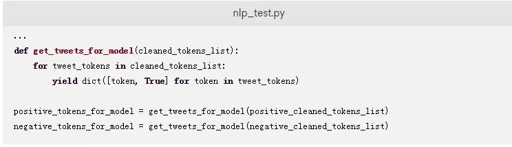 添加以下代码,将推文从一个已清理的标记列表转换为以键作为标记、以True作为值的字典。对应的字典被存储在positive_tokens_for_model和negative_tokens_for_model中。