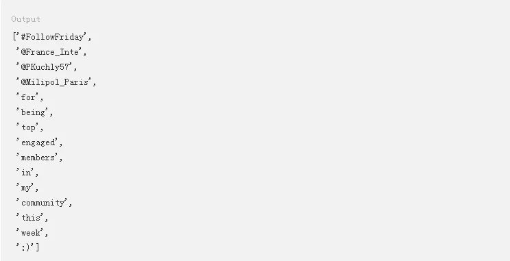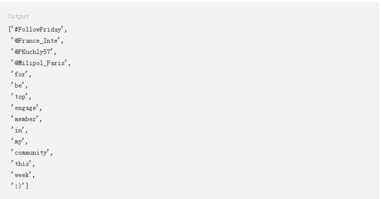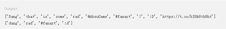 在这里,.tokenized()方法会返回特殊字符,比如@和_。本教程稍后部分将通过正则表达式删除这些字符。