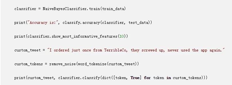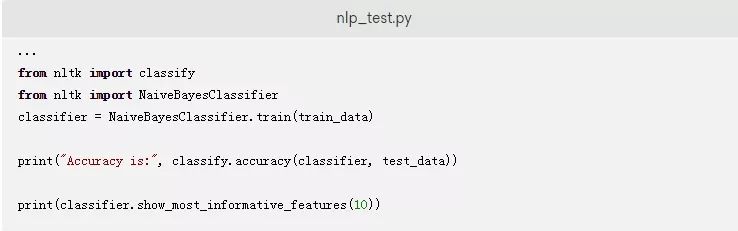 最后,您可以使用NaiveBayesClassifier类来构建模型。使用.train()方法来训练该模型,使用.accuracy()方法在测试数据上测试该模型。