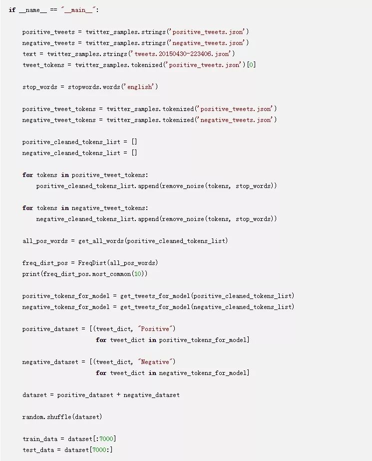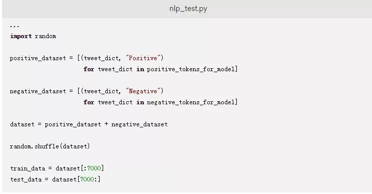 默认情况下,该数据包含所有正面的推文,然后依次跟着所有负面的推文。在训练模型时,您应该提供一个不包含任何偏差的您的数据样本。为了避免偏差,您已经添加了使用random的.shuffle()方法来随机排列数据的代码。