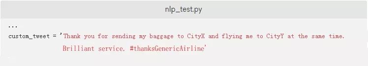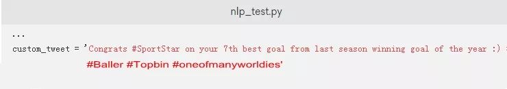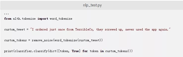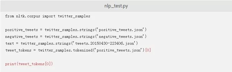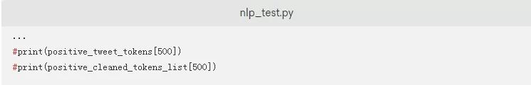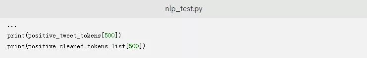 如果您想测试脚本以实际查看.tokenized方法,您只需要将突出显示的内容添加到您的nlp_test.py脚本中。这将标记解析来自positive_tweets.json数据集的一条推文: