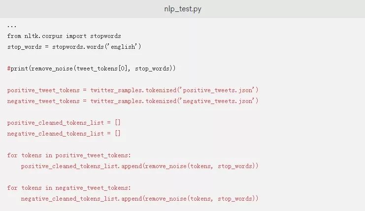 在进行下一步的建模练习之前,我们使用remove_noise()函数来清理积极和消极的推文。注释掉打印示例推文上的remove_noise()输出的行,并将以下内容添加到nlp_test.py脚本中: