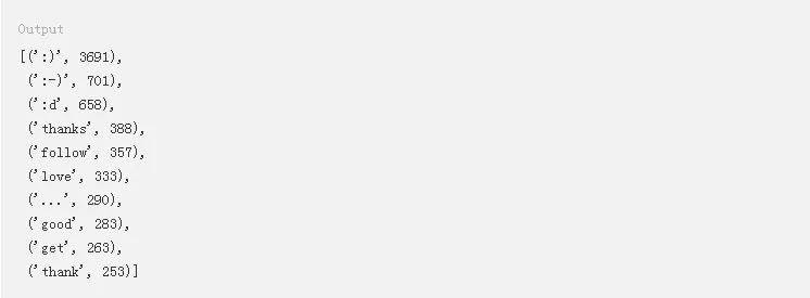 从这个数据中,您可以看到emoticon实体构成了正面推文的一些最常见的部分。在继续下一步骤之前,请确保您注释掉了脚本中打印前10个标记的最后一行。