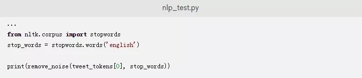 您可以使用.words()方法来获得一个英语停止词列表。要测试这个函数,让我们在我们的示例推文上来运行它。在nlp_test.py文件的末尾添加以下行: