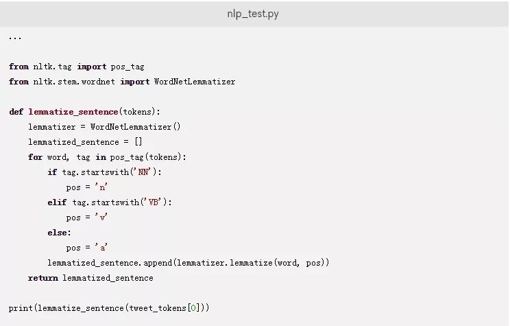 使用下面的函数来更新nlp_test.py文件,该函数会对一个句子进行词形还原: