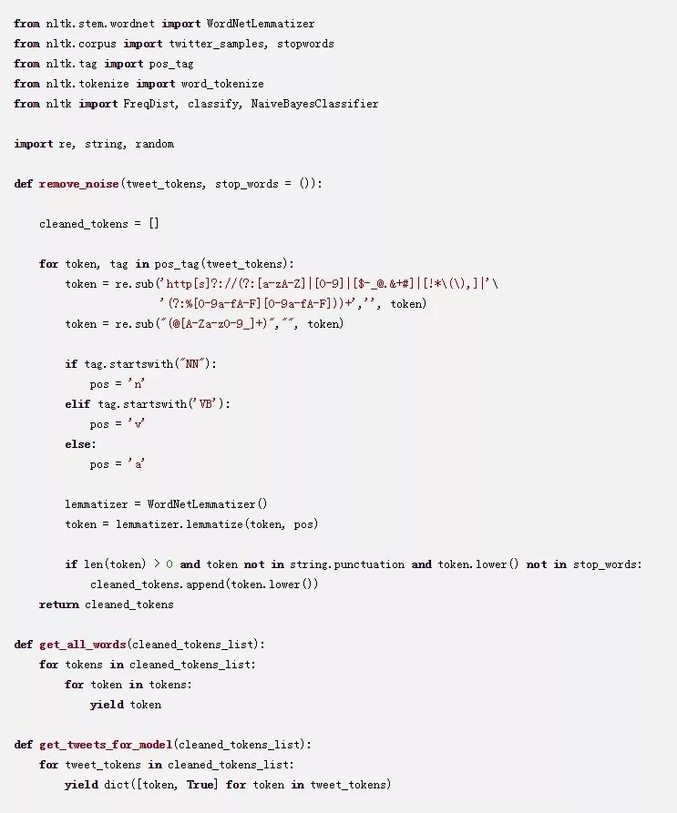 我们还将删除本教程中注释掉的代码和lemmatize_sentence函数,因为词形还原是由新的remove_noise函数来完成的。