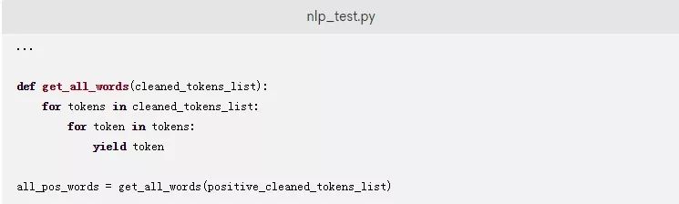 下面的代码段定义了一个名为get_all_words的生成器函数,该函数以一个推文列表作为参数,以提供一个将所有推文标记中的单词结合起来的单词列表。将以下代码添加到您的nlp_test.py文件中: