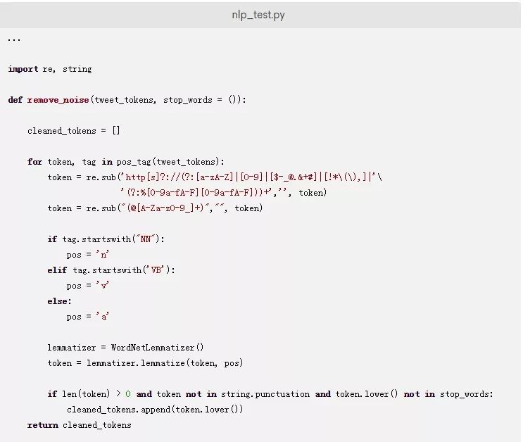 将以下代码添加到您的nlp_test.py文件中来从数据集中去除噪声: