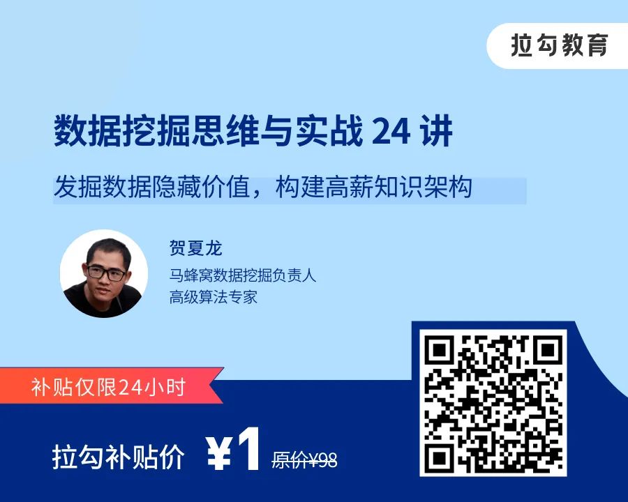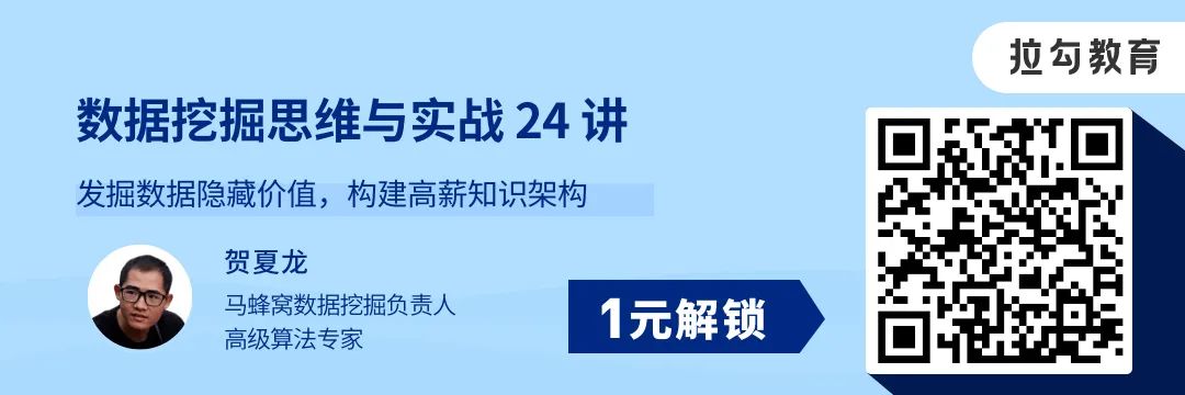 课程最后还有一个彩蛋,专栏的最后会提供数据挖掘的开源工具和学习资源:如果你不会写代码,也可以先使用这些工具来进行数据挖掘;如果你希望在数据挖掘方面有更加深入的学习和理解,那么这些资源也会帮到你。
