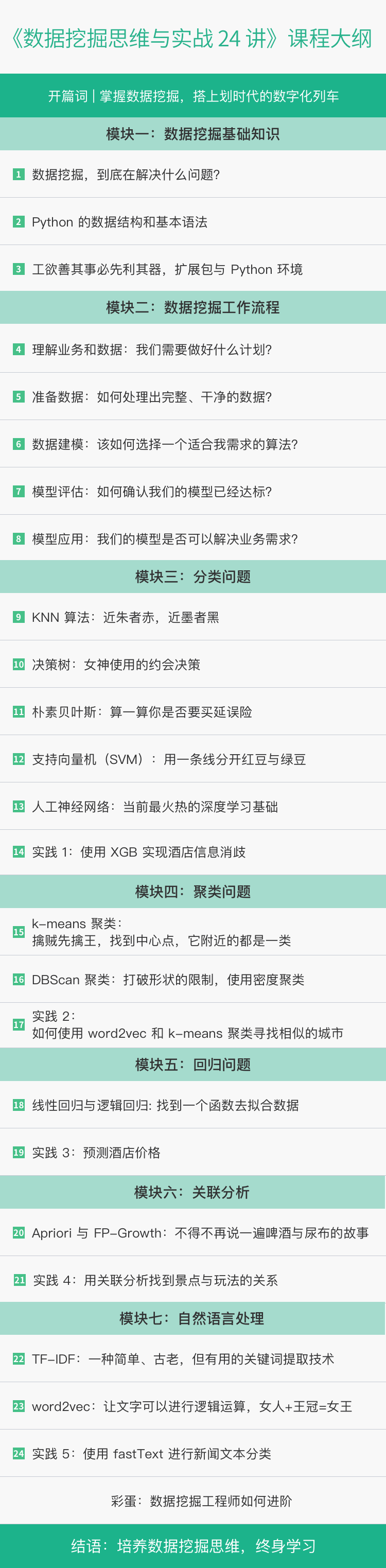 · 基础知识准备(模块一)。带你建立对数据挖掘的全局认知,学习课程中可能会涉及的一些基础知识(包括必备的 Python 语言知识,以及如何搭建 Python 环境),夯实基础知识,帮你快速进入状态。