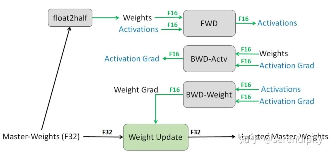 2. 承接第 1 条,就算梯度能够以 FP16 表示,但是 梯度 * 学习率 可能会下溢出。所以权重更新这步操作还是得在 FP32 下运行;