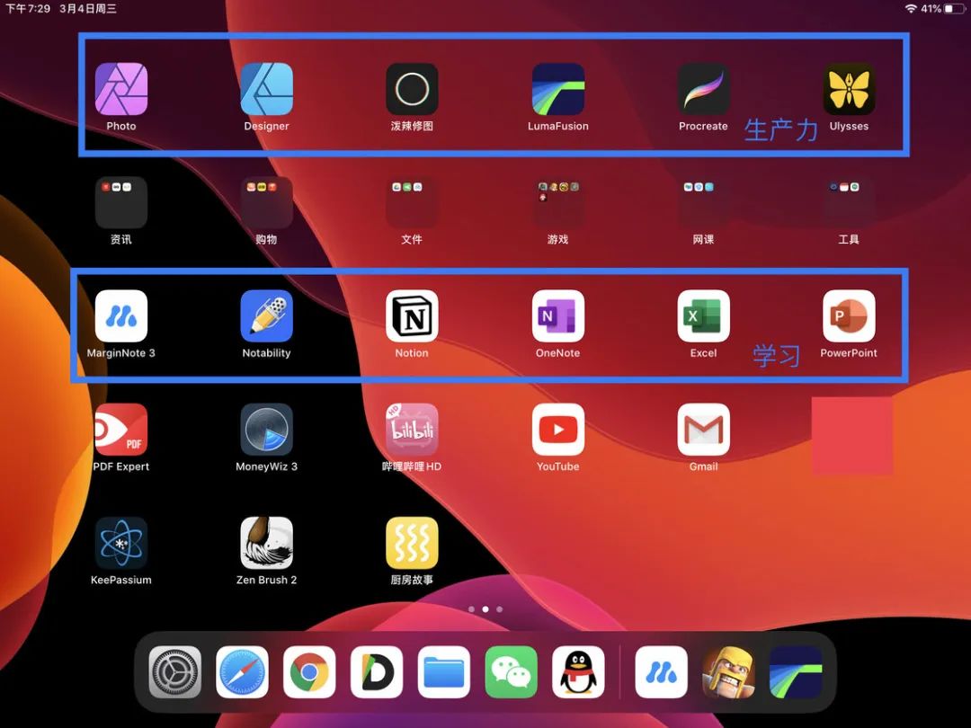 我就把它当个大手机来说吧,其实主要思路还是「视觉隔离」。首屏页给 Apple,第二屏我就开始遵循「最重要的放在最上面」这个原则了,因为平板相较手机来说,垂直距离大了很多,这样区分应用也方便了很多。最上面放最硬核的干活工具,抬眼就能看到,然后放一排文件夹隔离视线,下面放一排次重要的应用,都是点击一次就可以打开。所以我依然是「能走两步到达的不走三步」。这次,社交应用被我移到了 dock。