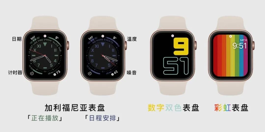 计时仍然是 Apple Watch 的核心功能。有了 Series 4 上的更大的屏幕空间之后,表盘显示也变得更加复杂起来。watchOS 6 所提供的新式表盘「加州表盘」是我目前最喜欢的表盘样式,并且支持同时显示 5 种不同的复杂功能。在表盘上的那个复杂功能很适合显示当前播放的歌曲名称,或者是接下来的一个日程,所以我将同样的表盘复制出两份,分别用来显示歌曲名称或者日程,并且将两个表盘相邻放置 —— 这样一来只要从屏幕边缘轻扫就可以快速切换两种表盘。